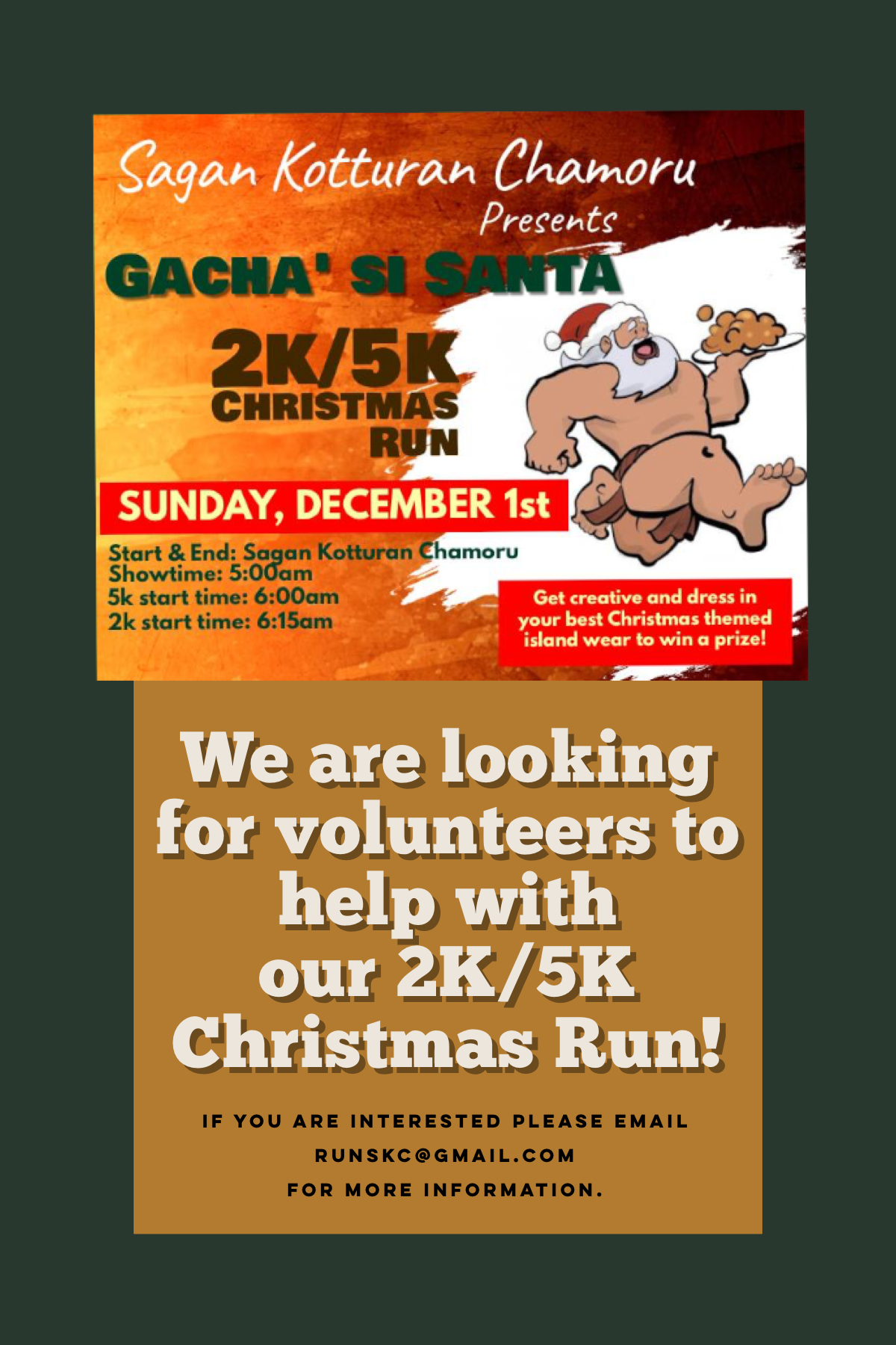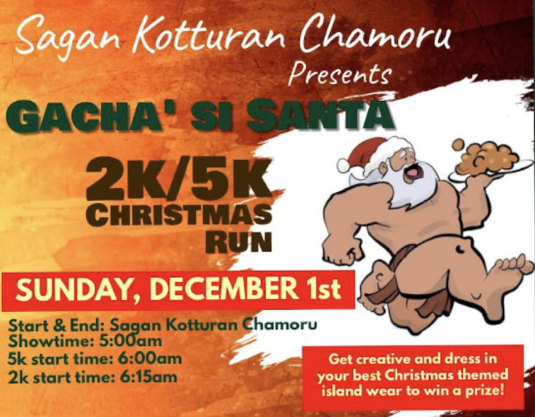 Our “Gacha’ si Santa” 2K/5K is a Chamorro Cultural Christmas Run and is the first of its kind, and will take place on December 1, 2019. From each volunteer, we will need at least two days of assistance at our early registration table from November 4-22, 2019; this will be located at Sagan Kotturan Chamoru Cultural Center, form 3-6pm.